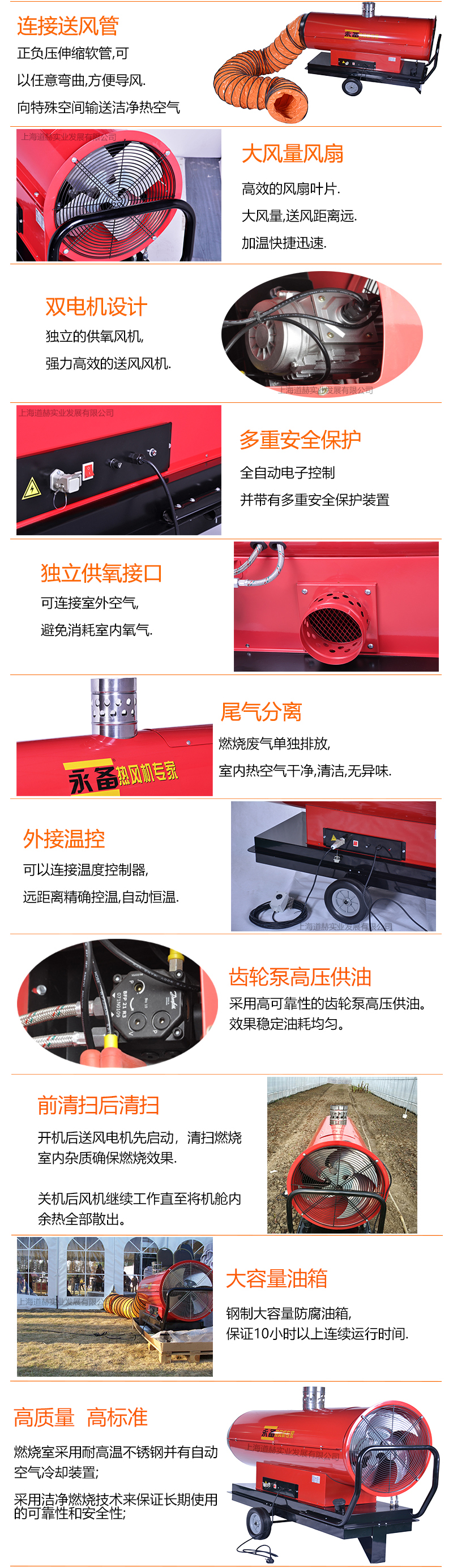 1.柴油或煤油用作燃料。燃燒產(chǎn)生的熱量由熱風機后部的強力風扇排出。采用清潔燃燒技術,充分燃燒燃料,減少有害物質